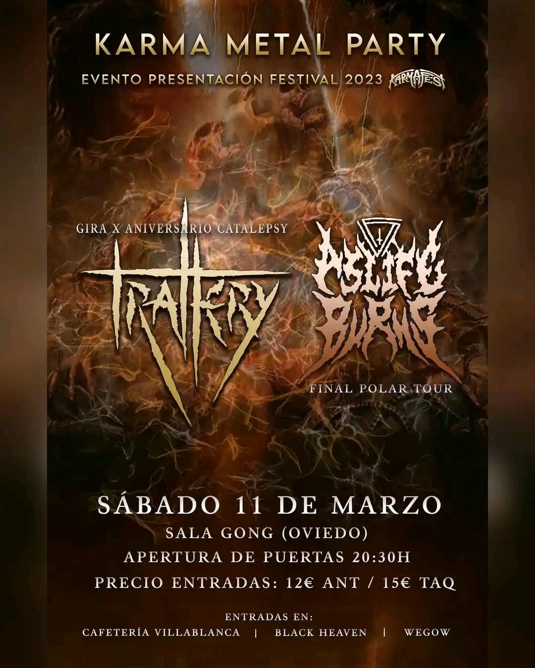El Karma Metal Fest presentará este sábado 11 de marzo su cartel completo con una fiesta en la sala Gong de Oviedo. Allí a partir de las 20:30h podremos disfrutar de Trallery en su gira "X Aniversario Cataplepsy" y As Life Burns cerrando gira antes de preparar nuevo material.
