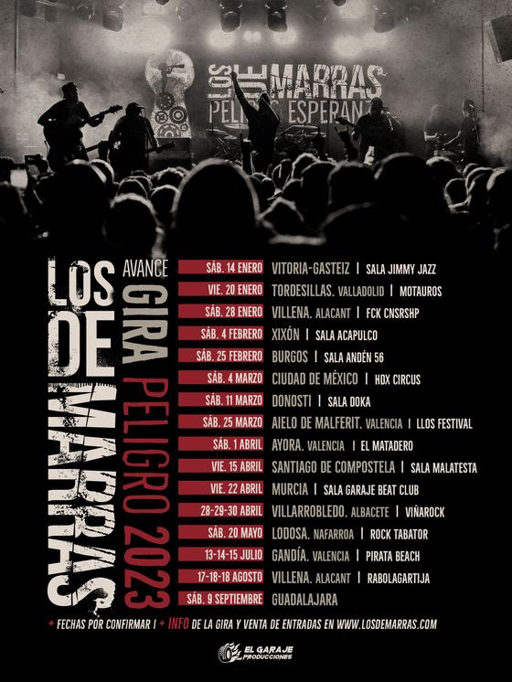 Hace dos años, en abril de 2021 veía la luz el último trabajo de estudio de Los de Marras, llamado "Peligro - Esperanza". Con ese trabajo han estado girando hasta ahora y sin parar, hace unos días anunciaban una nueva gira para este 2023, que tendría como nombre "Peligro 2023" con la que pasarán por distintas ciudades y festivales: