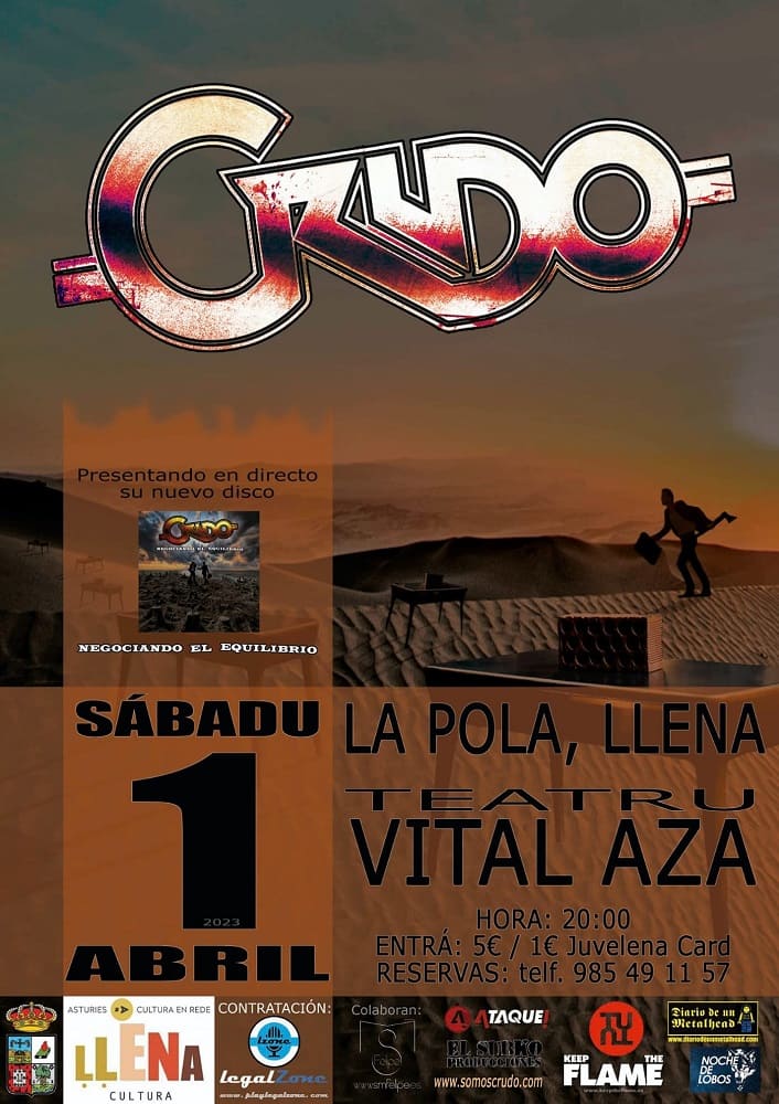 Este sábado 1 de abril Crudo estarán presentando su último disco "Negociando el Equilibrio" en el Teatro Vital Aza de Pola de Lena (Asturias). Será su primer concierto con su nueva formación y comenzará a eso de las 20:00.
